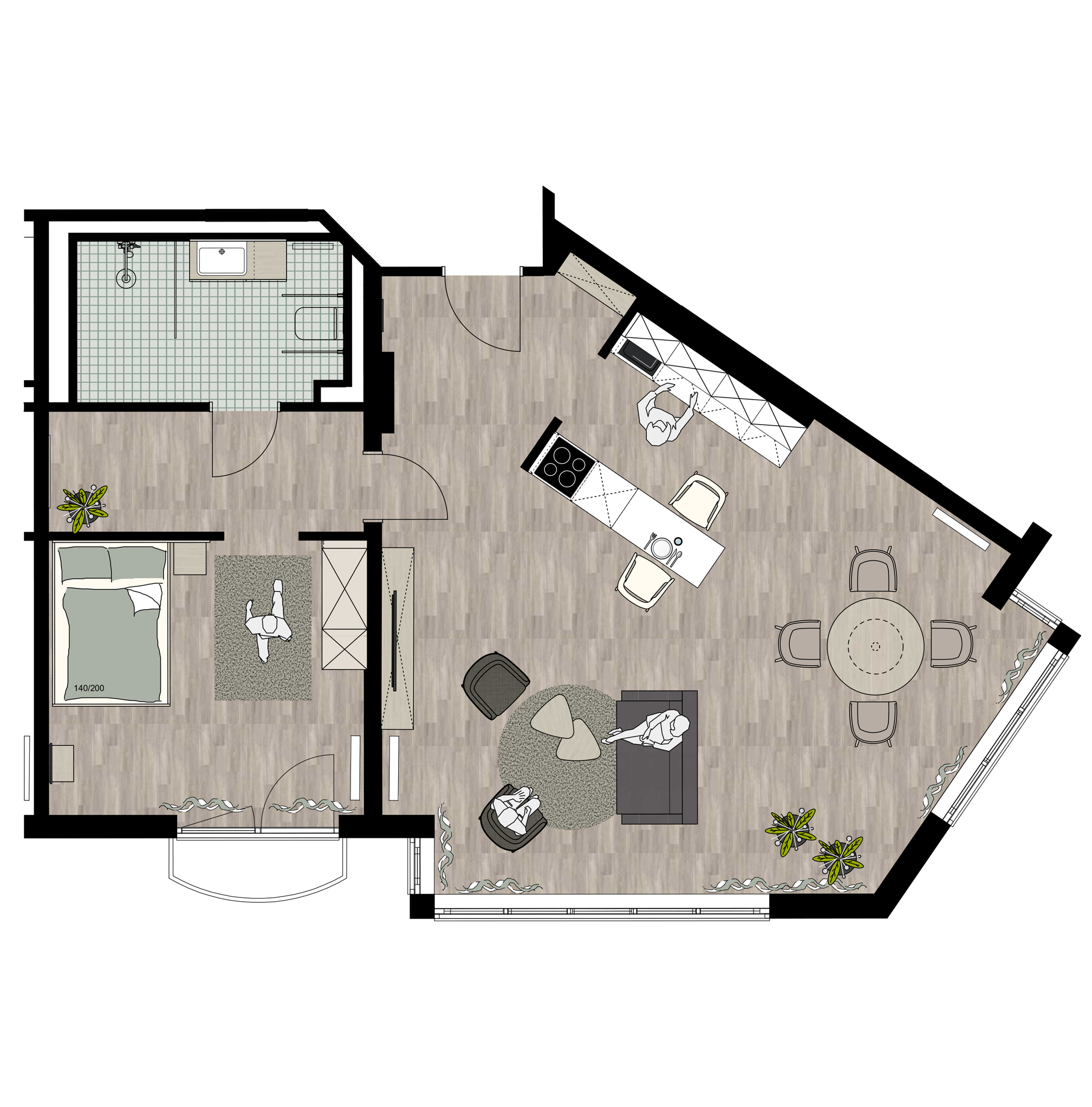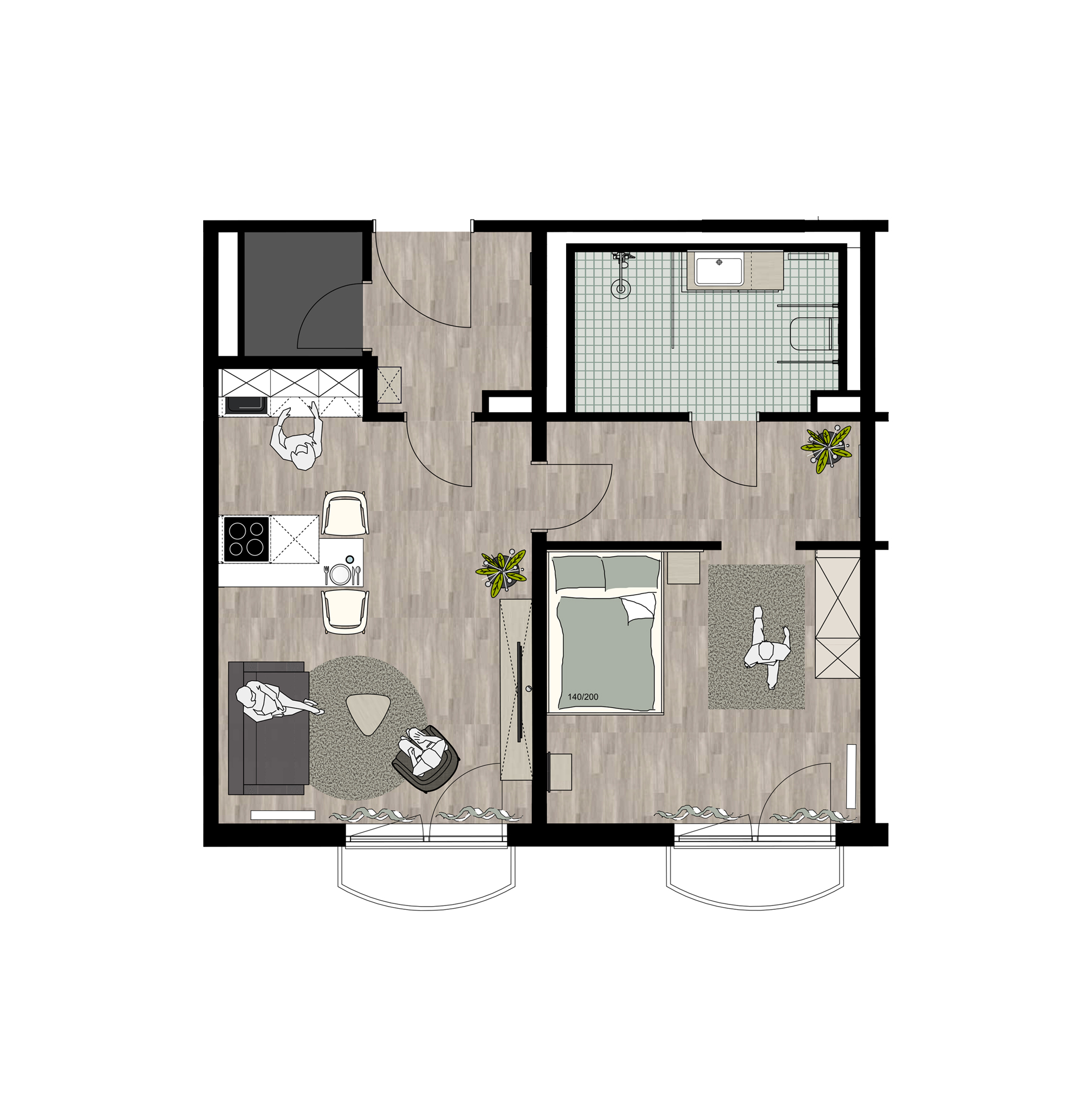 *Sämtliche Abbildungen zeigen eine Musterausstattung. Alle gezeigten Einrichtungsgegenstände und Möbel (außer der Küche) sind nicht Bestandteil der Mietsache.